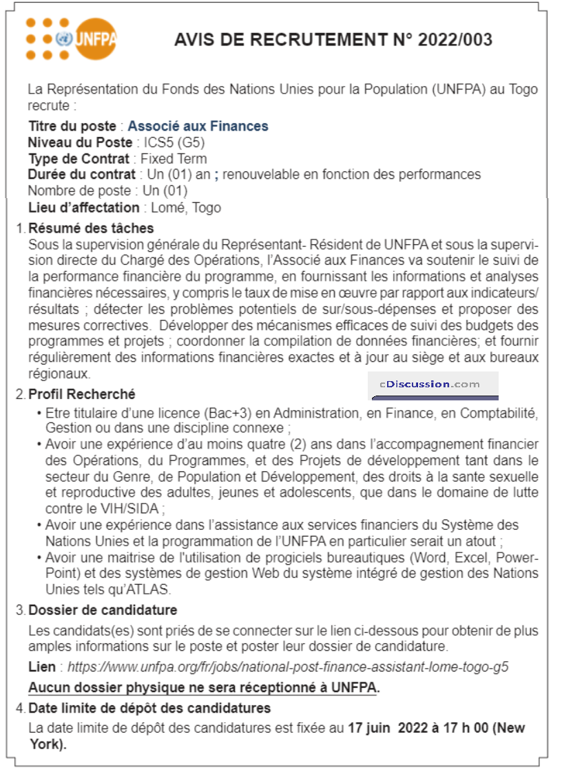 UNFPA au Togo recrute un Associé aux Finances
